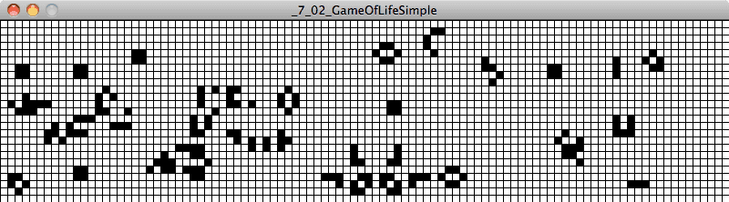 The development of cellular automata systems is typically attributed to Stanisław Ulam and John von Neumann, who were both researchers at the Los Alamos National Laboratory in New Mexico in the 1940s. Ulam was studying the growth of crystals and von Neumann was imagining a world of self-replicating robots. That’s right, robots that build copies of themselves. Once we see some examples of CA visualized, it’ll be clear how one might imagine modeling crystal growth; the robots idea is perhaps less obvious. Consider the design of a robot as a pattern on a grid of cells (think of filling in some squares on a piece of graph paper). Now consider a set of simple rules that would allow that pattern to create copies of itself on that grid. This is essentially the process of a CA that exhibits behavior similar to biological reproduction and evolution. (Incidentally, von Neumann’s cells had twenty-nine possible states.) Von Neumann’s work in self-replication and CA is conceptually similar to what is probably the most famous cellular automaton: the “Game of Life,” which we will discuss in detail in section 7.6.