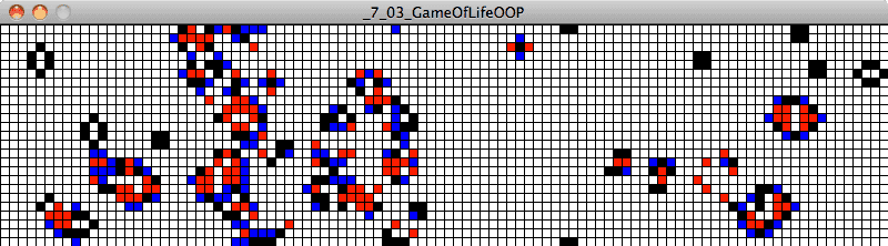 Finally, once the next generation is calculated, we can employ the same method we used to draw the Wolfram CA—a square for each spot, white for off, black for on.