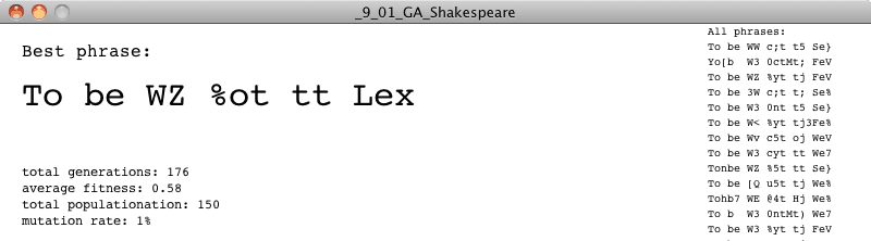Now, it’s worth noting that this problem (arrive at the phrase “to be or not to be that is the question ”) is a ridiculous one. Since you know the answer, all you need to do is type it. Here’s a p5.js sketch that solves the problem.