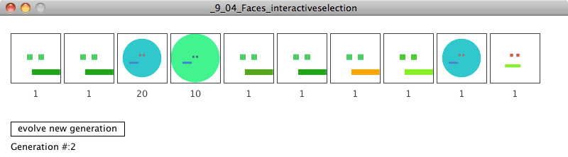 In the field of genetics, there is an important distinction between the concepts genotype and phenotype. The actual genetic code—in our case, the digital information itself—is an element’s genotype. This is what gets passed down from generation to generation. The phenotype, however, is the expression of that data. This distinction is key to how you will use genetic algorithms in your own work. What are the objects in your world? How will you design the genotype for your objects (the data structure to store each object’s properties) as well as the phenotype (what are you using these variables to express?) We do this all the time in graphics programming. The simplest example is probably color.