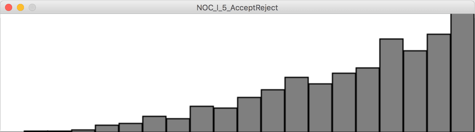 Conveniently, this is how the random() function works. p5’s random number generator (which operates behind the scenes) produces what is known as a “uniform” distribution of numbers. You can test this distribution with a sketch that counts each time a random number is picked and graphs it as the height of a rectangle.