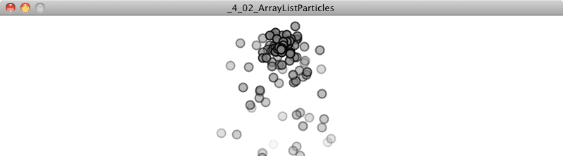 Thankfully, the wonderful JavaScript Array has all the functionality we need for managing a list of Particle objects. The the built-in JavaScript functions available in the JavaScript class Array will allow me to add and remove particles and manipulate the arrays in all sorts of powerful ways. Although there are some cons to this approach, in order to keep the subsequent code examples more concise, I'm using a solution to Exercise 4.1 and assume a run() method that handles all of the particle's functionality. JavaScript Array Documentation.
