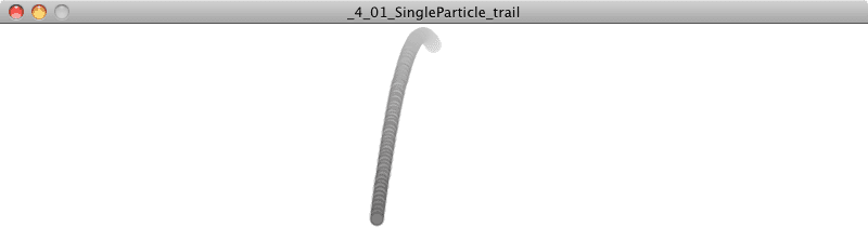 Before I get to the next step of making many particles, it’s worth taking a moment to make sure the particle works correctly and create a sketch with one single Particle object. Here is the full code below, with one small addition–giving the particle a random initial velocity as well as adding applyForce() (to simulate gravity).