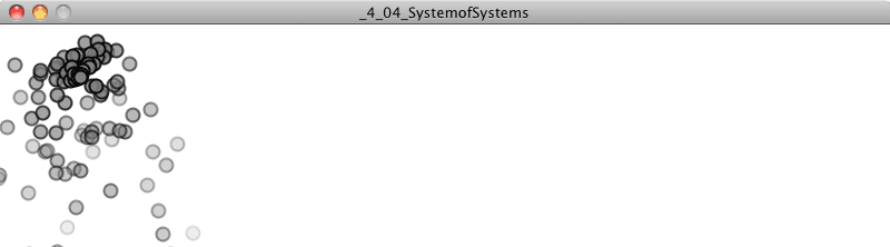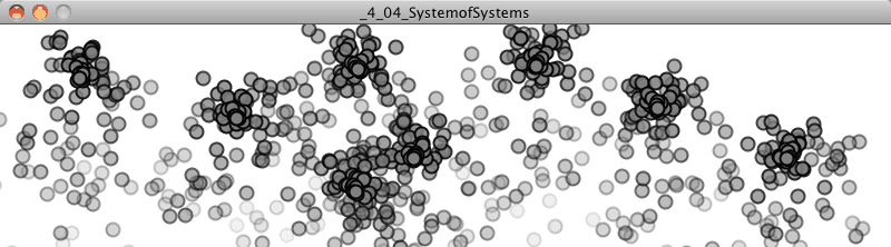 I’ve defined a particle system to be a collection of independent objects, often represented by a simple shape or dot. Why does this matter? Certainly, the prospect of modeling some of the phenomena listed (explosions!) is attractive and potentially useful. But really, there’s an even better reason to explore particle systems. If you want to get anywhere in this nature of code life, you’re likely to find yourself developing systems of many things–balls bouncing, birds flocking, ecosystems evolving, all sorts of things in plural.
