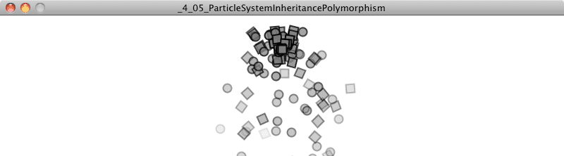 Finally, working with particle systems is also a good excuse to tackle two other object-oriented programming techniques: inheritance and polymorphism. With the examples you’ve seen up until now, I’ve always used an array of a single type of object, like "movers" or “oscillators.” With inheritance (and polymorphism), I’ll demonstrate a convenient way to store a single list containing objects of different types. This way, a particle system need not only be a system of a single type of particle.